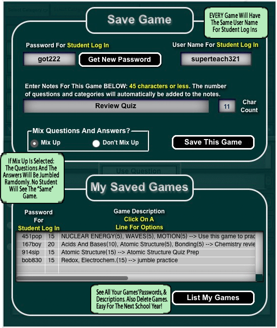 You will be able to create a free account to save games to reuse each school year. Hundreds